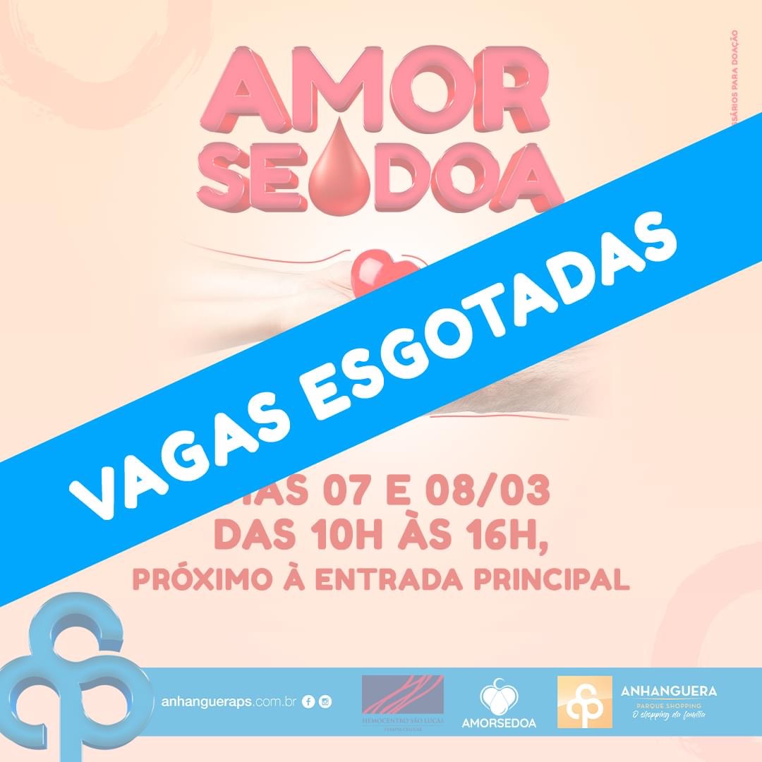 O Anhanguera Parque Shopping realizará nos próximos dias 07 e 08 de março de 2022 a campanha de  doação de sangue junto com  a ong Amor se Doa, e o hemocentro São Lucas, uma ação que busca conscientizar a importância de ser um doador.