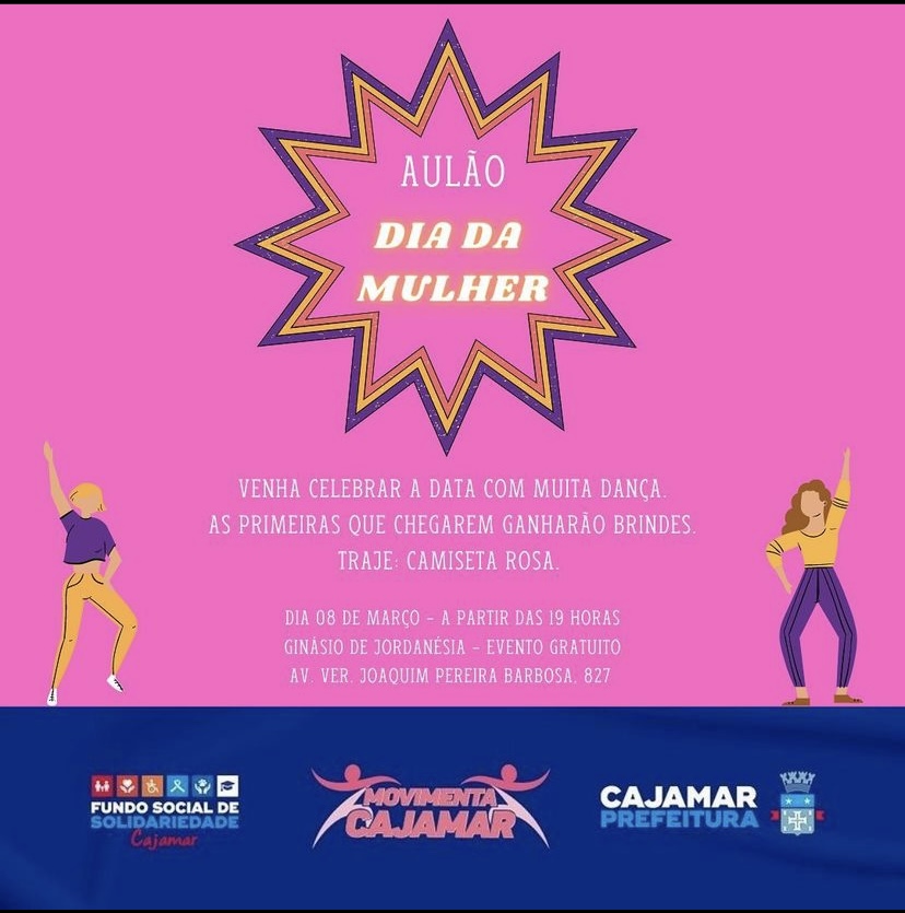 A partir das 19h00 acontece o aulão de dança especial para o dia Internacional da mulher o evento é gratuito com a parceria do Fundo Social e do Movimenta Cajamar será realizado no ginásio de esportes em Jordanésia.